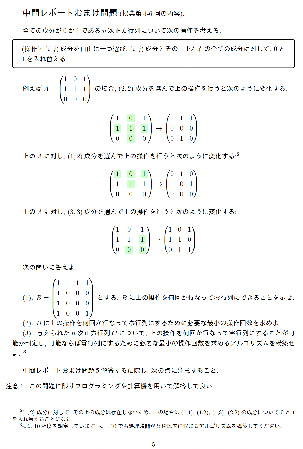 これも安田先生の本から. ライツアウトを数学的に扱うとはさすが安田先生である. なお安田先生の本に大まかな答えが載っている. 面白いのはn=1,2,3の時は常に0行列にできるのだが, n=4, 5だとできない例がある.