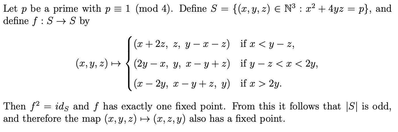 This is the famous “Zagier’s one sentence proof”. I first learned it in an algebra exercise class when I was a third-year student at university. There is a proof in Proofs from THE BOOK .